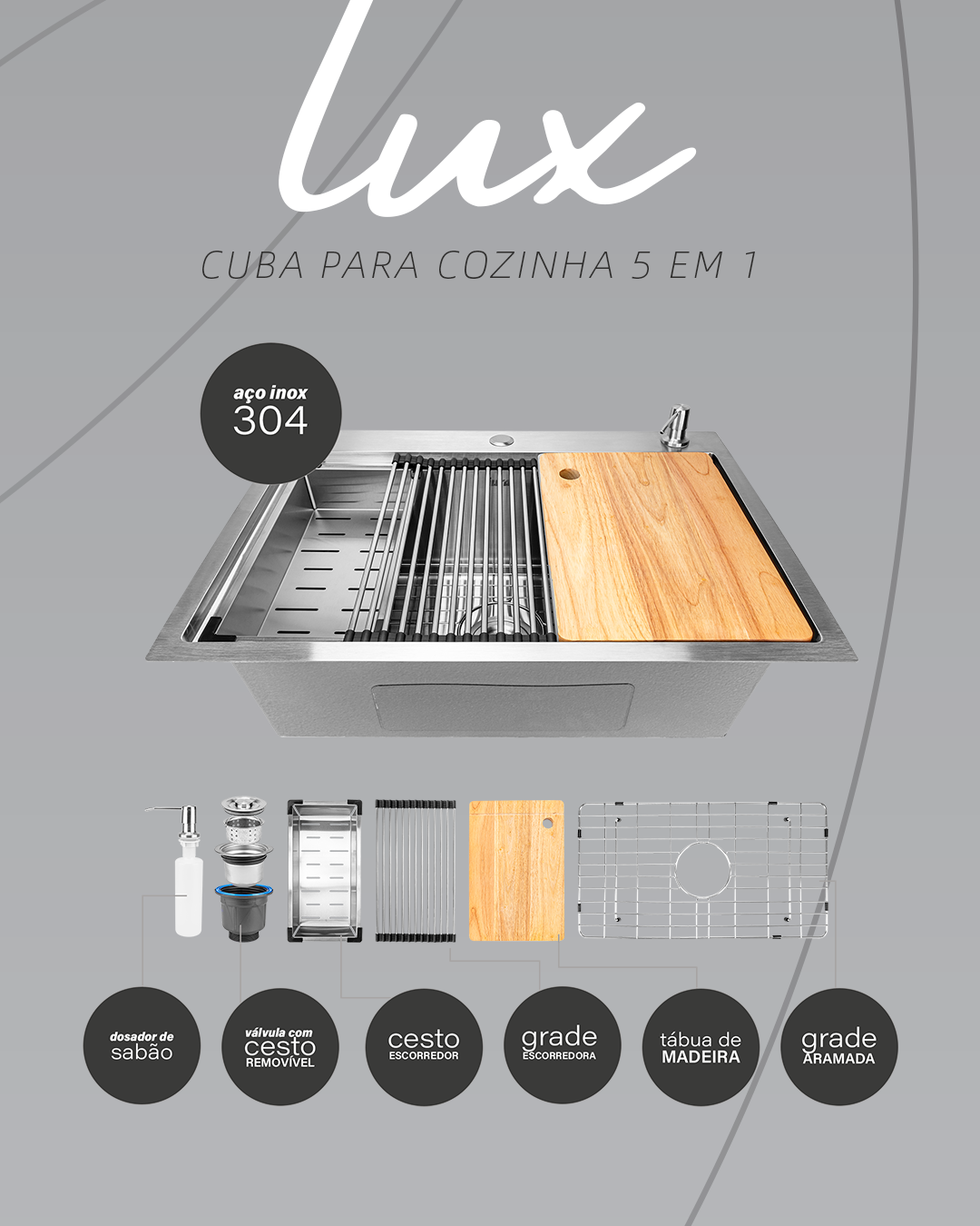 Para completar, a Lux tem válvula 4 1/2 com escape e cesto removível para o acúmulo de resíduos e dosador de sabão em Inox inclusos. Mais do que uma cuba, uma experiência incrível para sua cozinha.