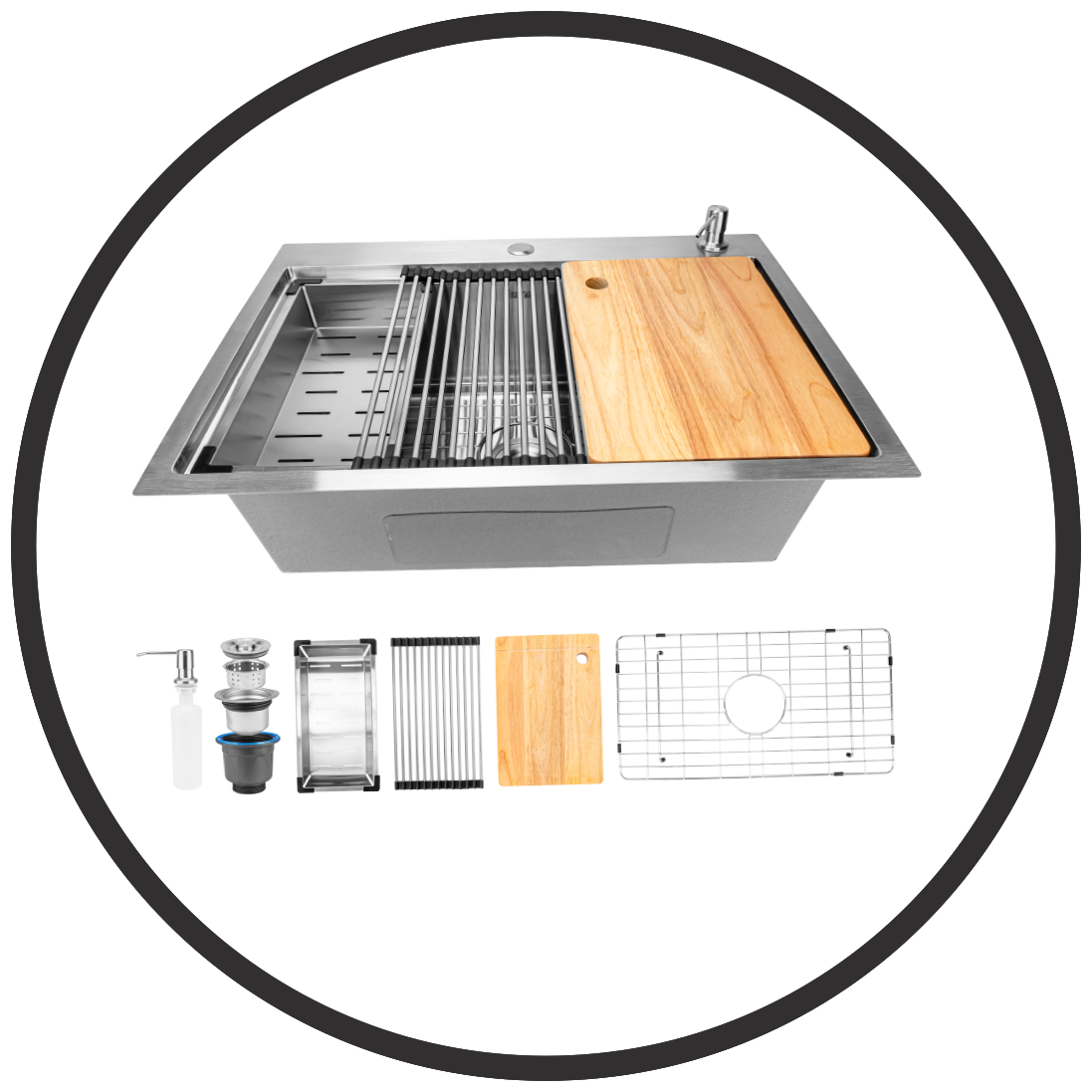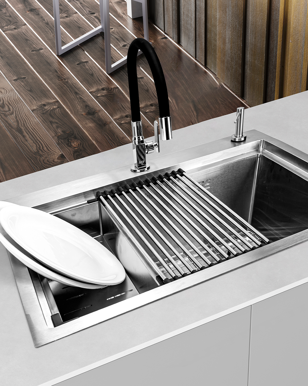 Fabricada em Aço Inox 304 e espessura 2.0+0.8 MM, a Cuba para Cozinha 4 em 1 Lux Iura tem tudo o que você precisa em apenas um produto. É uma verdadeira estação all in one, com os 6 acessórios indispensáveis para qualquer cozinha e um design clean e elegante, com acabamento escovado.